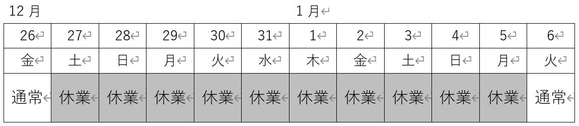 さて、誠に勝手ながら年末年始の休業を下記の通り実施致します。